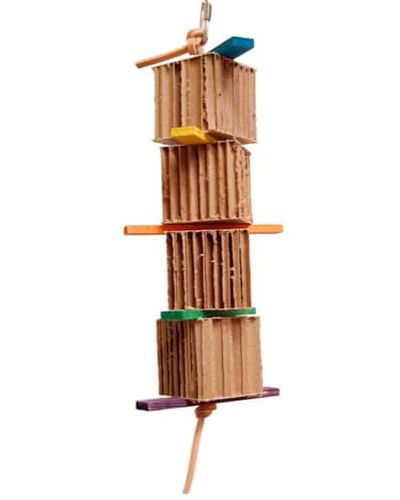 One of our bestsellers, this toy has four accordion style paper boxes with wood slats in between and is strung on leather. Fill the boxes with treats or small toy parts to turn this into a great foraging toy.
