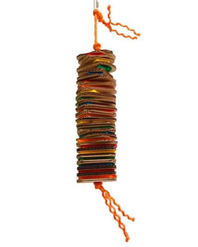 Slices of honeycomb paper are layered with colored slices of wood and hung on sisal rope. This big toy will keep your bird from getting bored with the tons of texture it offers, there is so much to shred and chew!